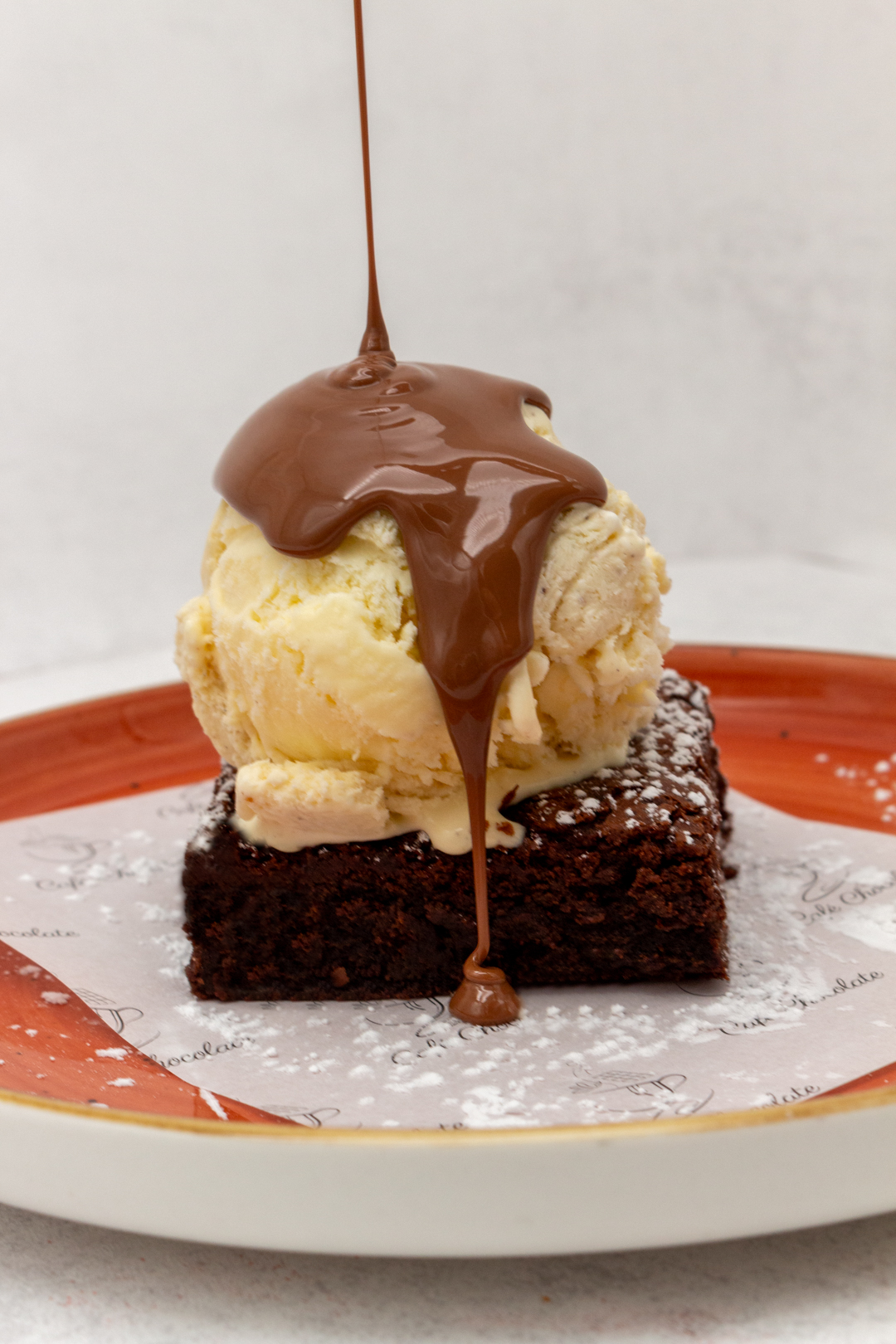 Warmer Brownie mit Vanille Eis & Vollmilch Schokolade